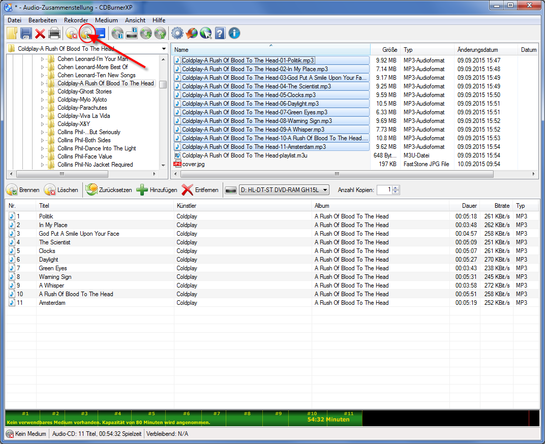 die zu brennenden MP3-Files wohl etwa 54:32 Minuten