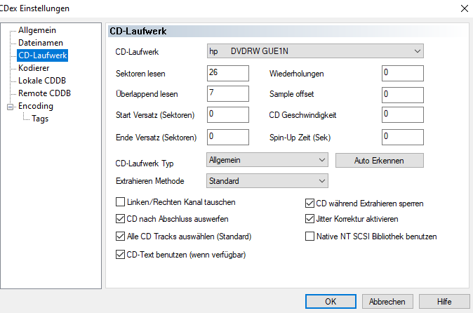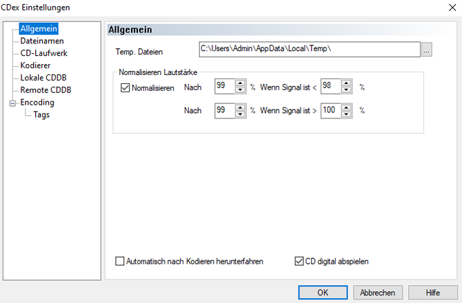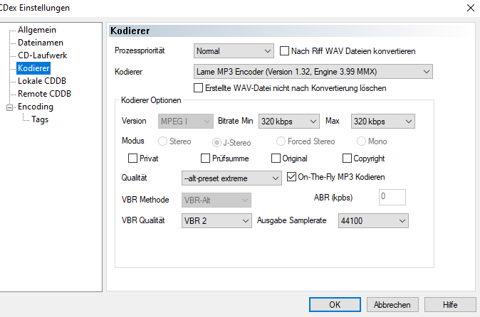 Einstellungen, die ich mit CDex 1.51 benutzte. Speicherplatz